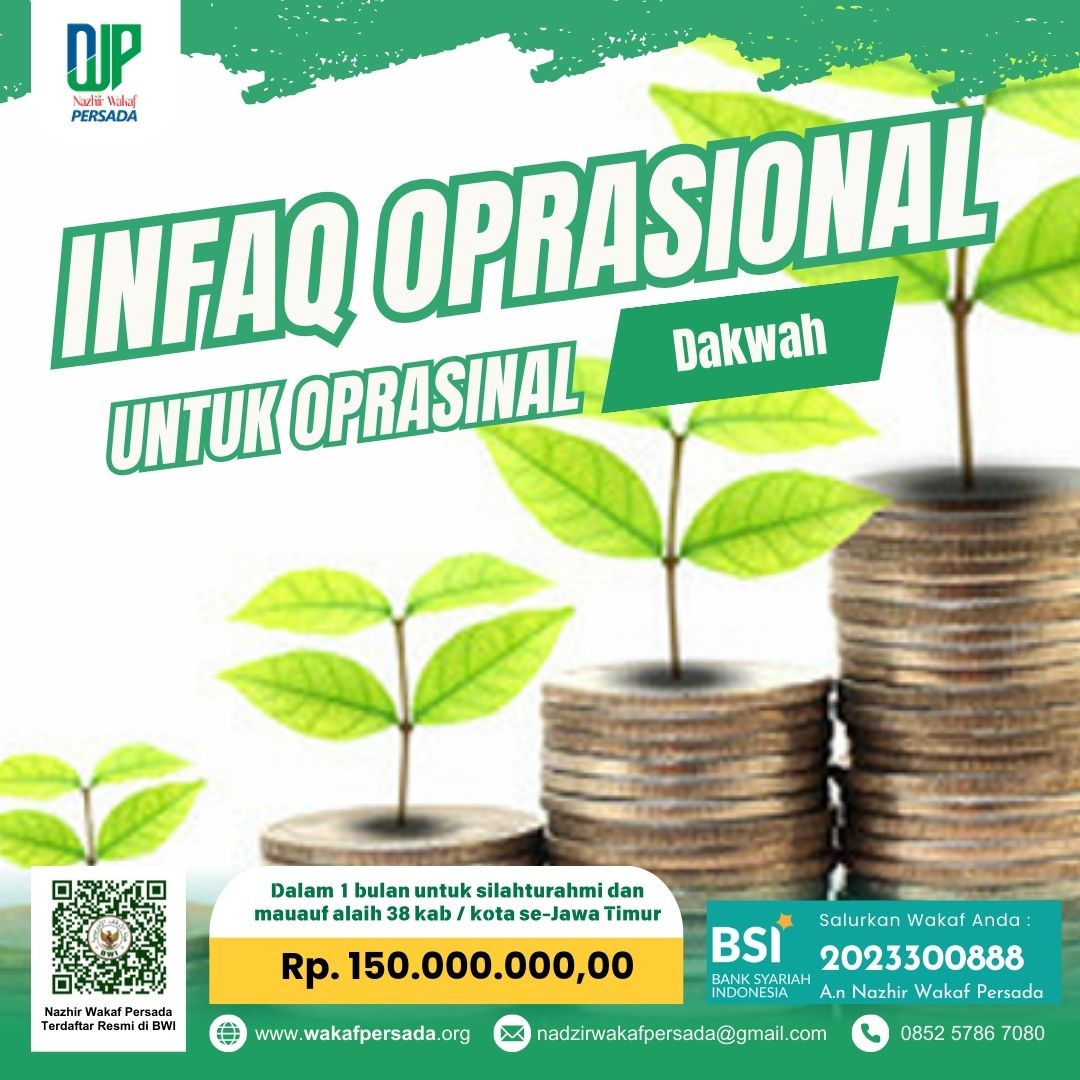 Dukung Operasional & Dakwah, Nazhir Wakaf Persada mengajak Anda untuk berpartisipasi dalam mendukung kegiatan operasional dan dakwah kami melalui infaq. Seiring dengan komitmen kami dalam membina 40 panti asuhan mitra yang tersebar di 38 kabupaten/kota di Jawa Timur, diperlukan dukungan dana operasional yang cukup besar guna menjalankan berbagai program pendampingan.
